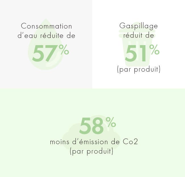 Nous nous engageons à réduire notre empreinte écologique (émissions de CO2, consommation d'eau, production de déchets) de 60% * avant 2020. Voyez ce que nous avons réussi à réaliser en 2015 sur le tableau ci-contre.